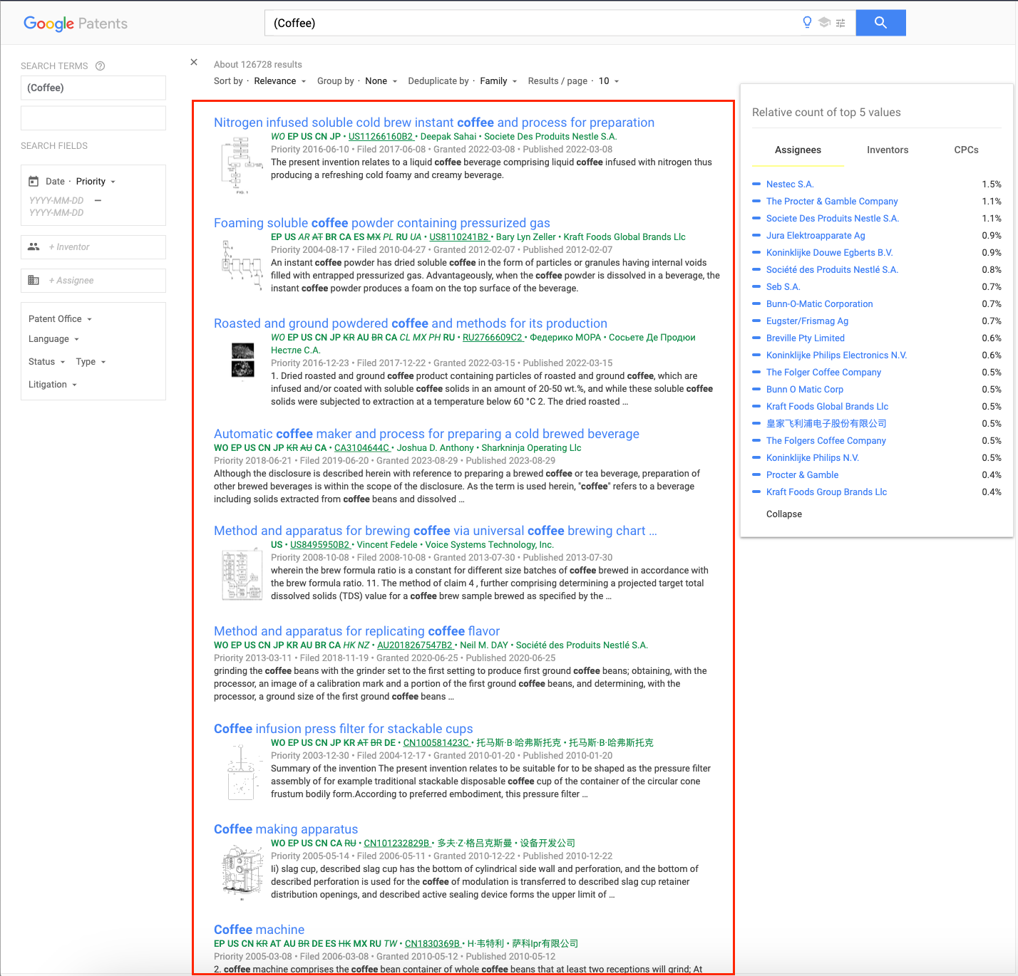 organic_results = results["organic_results]I went with the default "q": "(Coffee)", in addition to "engine": "google_patents" and "page": page_number, which uses the variable we defined before. Additionally, I've assigned the organic_results variable, which will be our primary source of information.