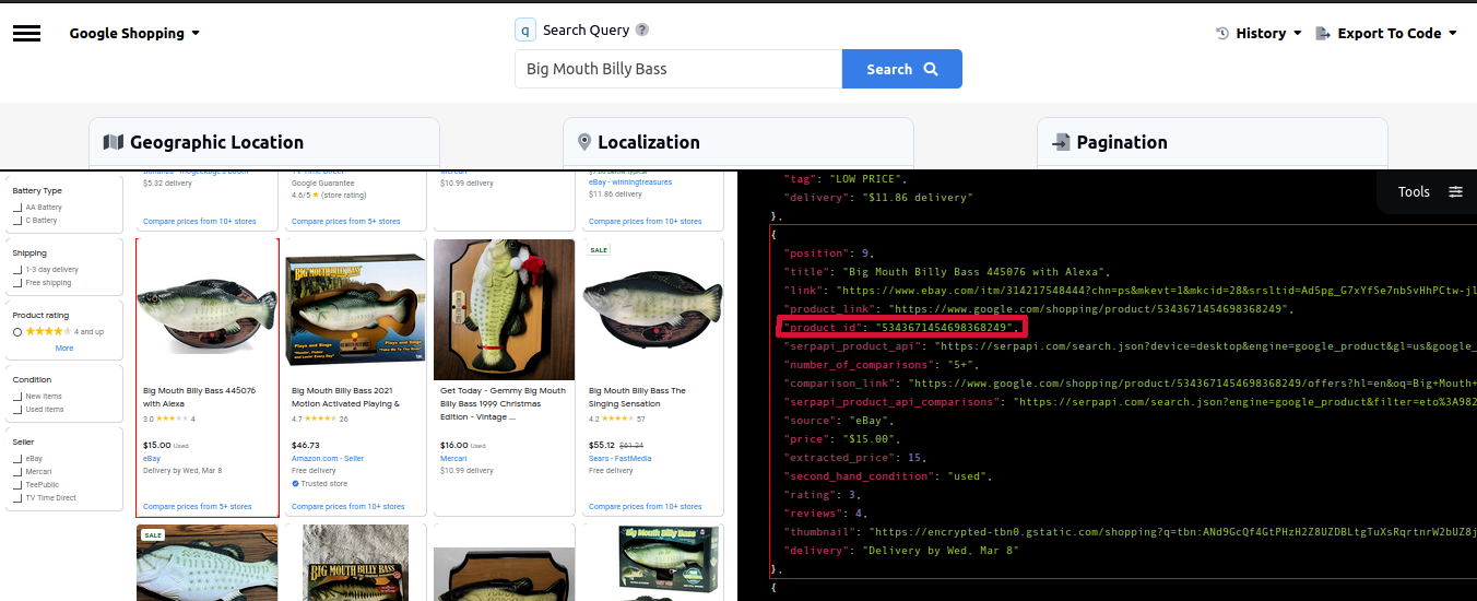 For example, look at this Google Shopping API search example in the SerpApi Playground: