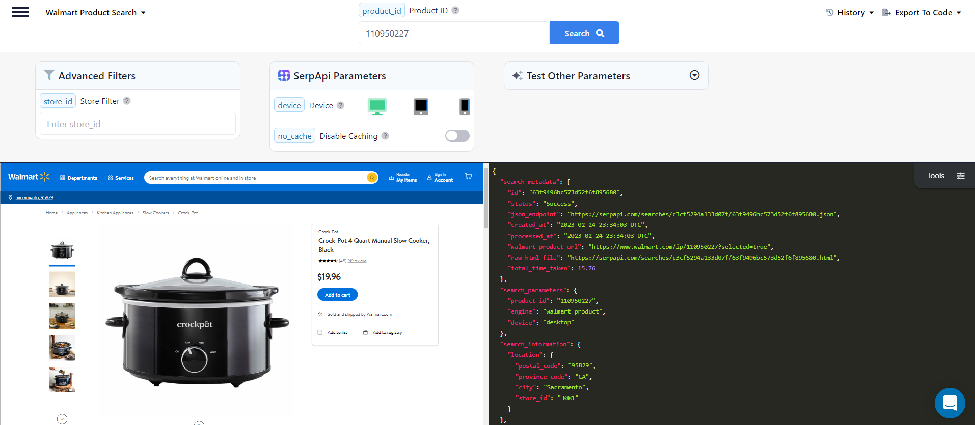 There are a few differences when scraping product details from the Walmart API. While product results in a Walmart search do have a product_id, they also have a us_item_id. We need to use the us_item_id if we want the results to include Reviews.