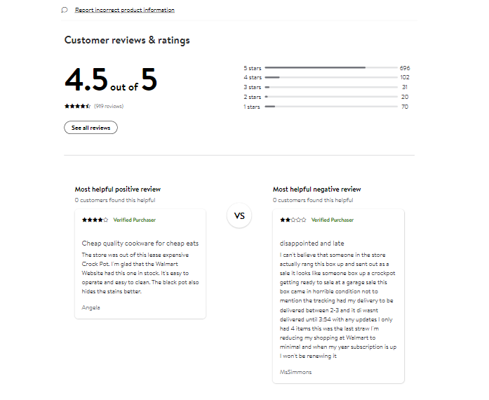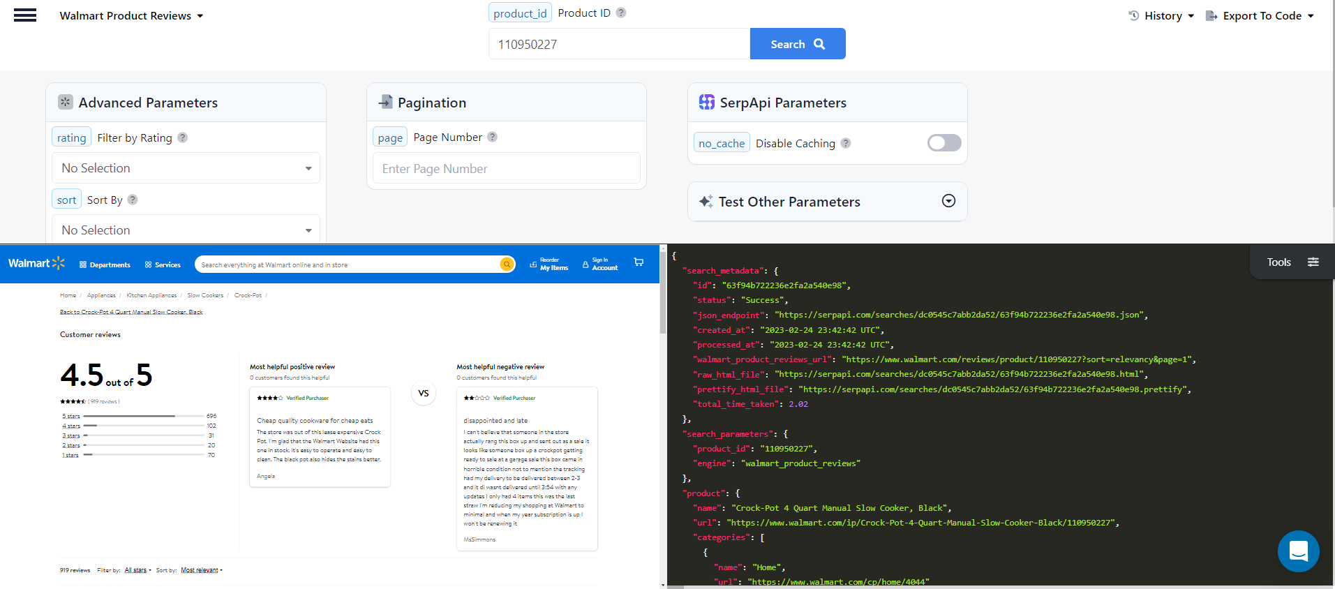 We also have a separate API for getting Walmart Product Reviews. This API also requires the us_item_id to be supplied as the value of the product_id parameter: