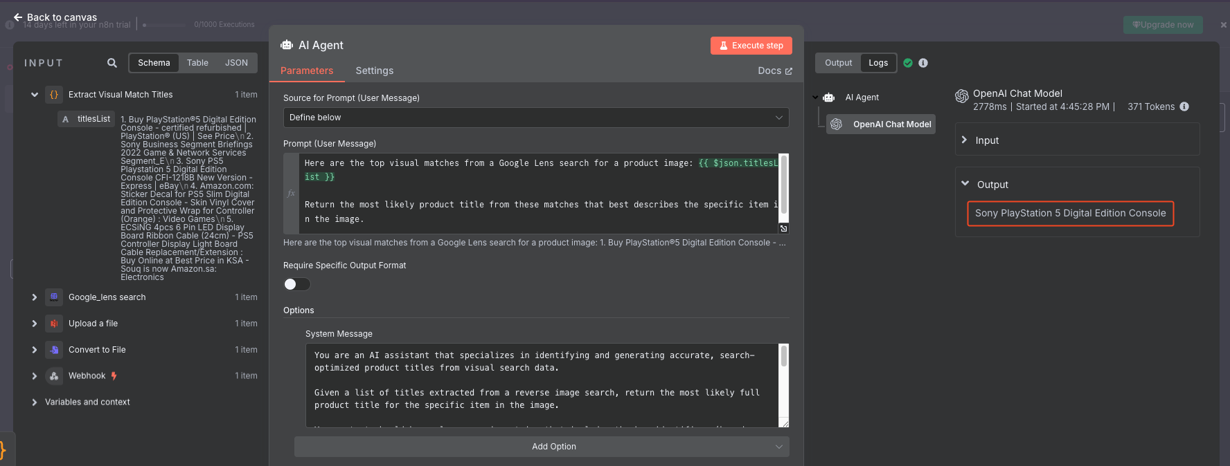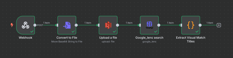 Now we will extend the workflow from Part 1. After extracting the list of possible titles, we’ll add steps for AI processing and eBay lookup. Referring to the workflow diagram (from Part 1) for context, our new nodes will come after the “Extract Visual Match Titles” step.