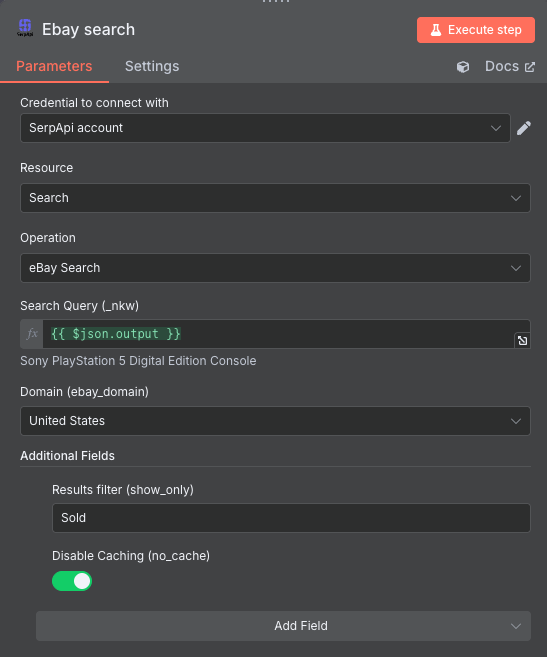From the SerpApi node, add the Search eBay action to the workflow. From the parameters menu, we'll only need to set the following: