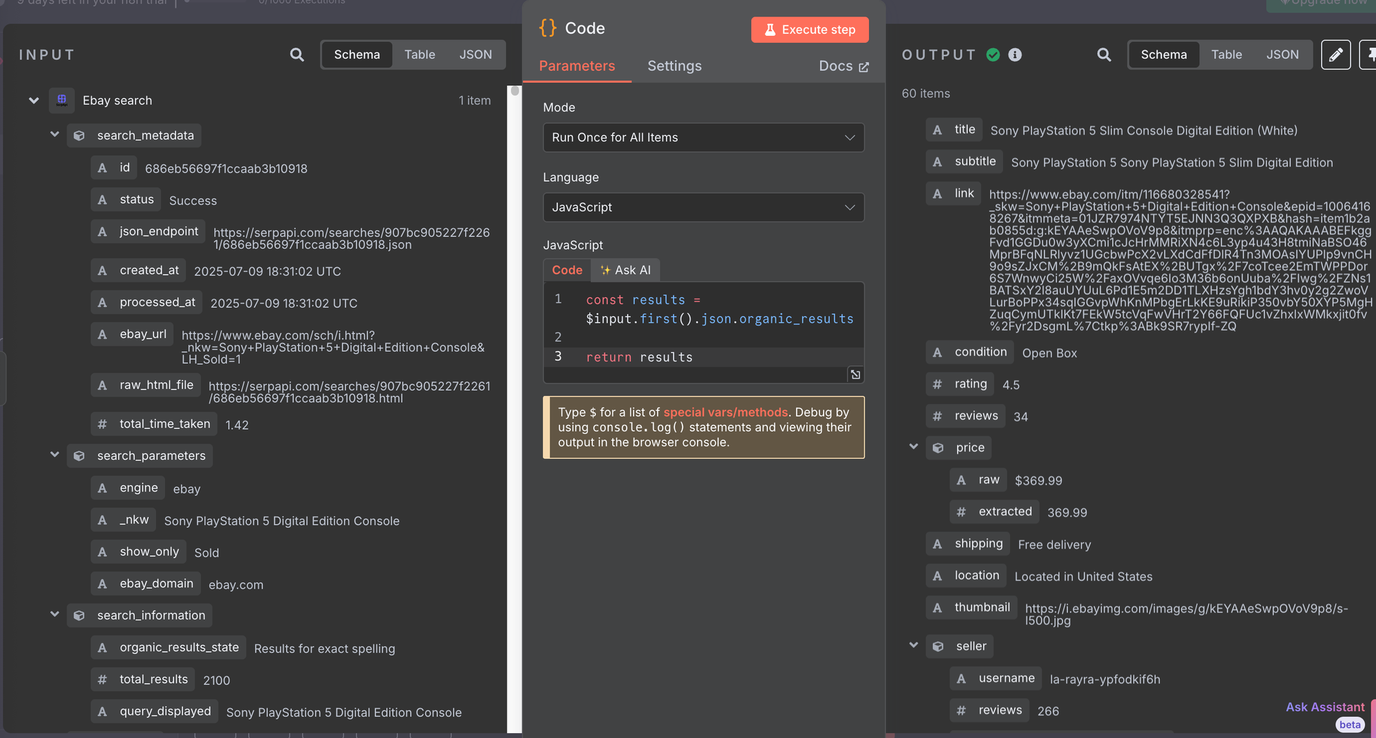First, we need to extract the organic results from the eBay API response using a Code node. I’ve used JavaScript here, but you can also use Python: