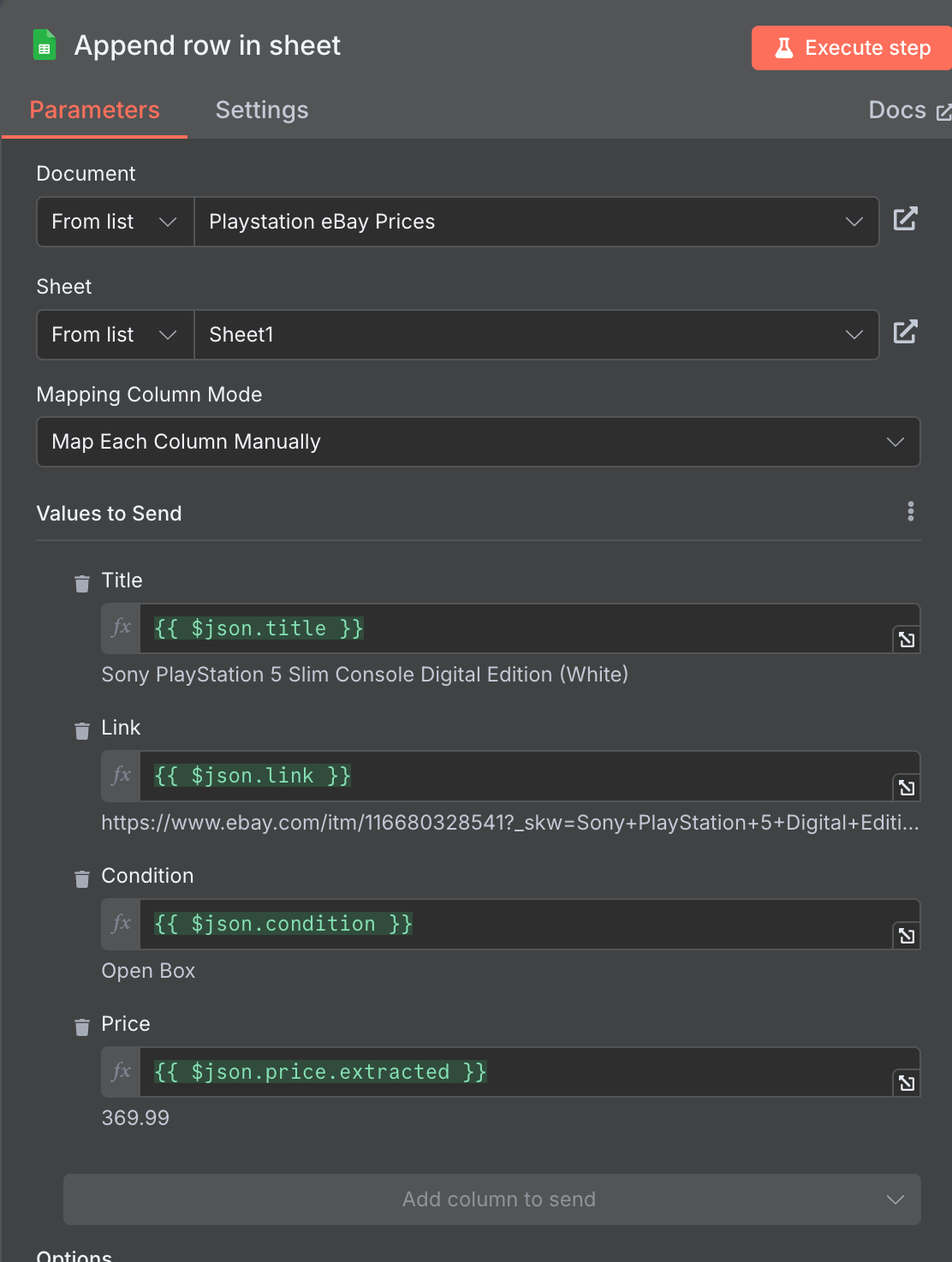 Next, configure the Google Sheets node by selecting the “Append row in sheet” operation. Choose the document and sheet you want to write to, and make sure you’ve already added columns for each data point you plan to include. In this example, I’ve added Title, Link, Condition, and Price.