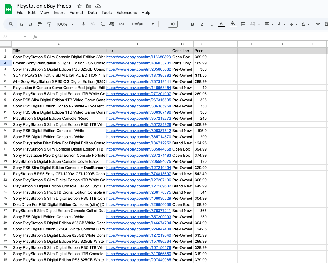 For each sold item returned, we want to create a row in our sheet to make it easy to filter and sort information such as the title, condition, and price.