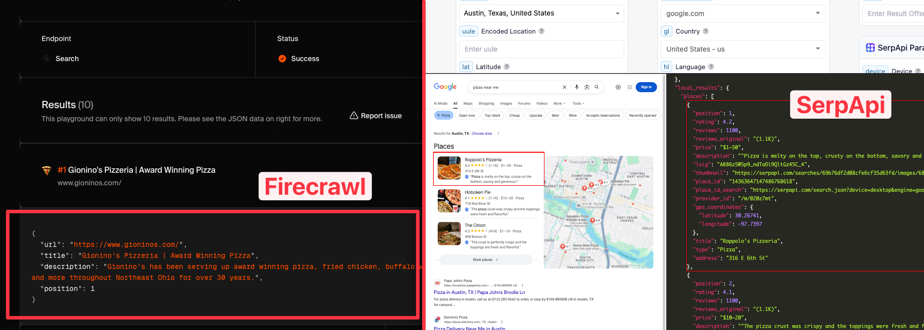 SerpApi returns JSON with specific parsers for each SERP feature. When you query "pizza near me", SerpApi's response includes structured fields for rating, review counts, position ranking, hours of operation, and price indicators. Firecrawl returns basic fields like title, URL, and description.