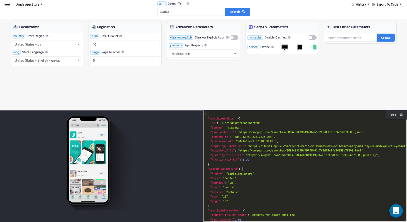 I was interested in what developer apps would show up for SerpApi’s favorite search of “coffee” and as expected, there were different top results for organic results: