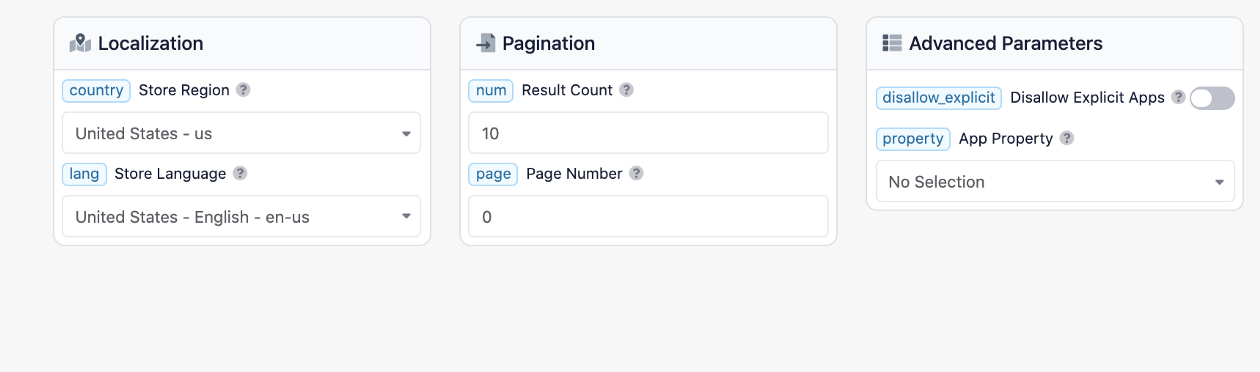 There’s a localization card with country and lang . The standard pagination parameters num and page. And the most API specific parameters are the advanced parameters of disallow_explicit and property. There has not been the same verbiage on any of the other APIs.