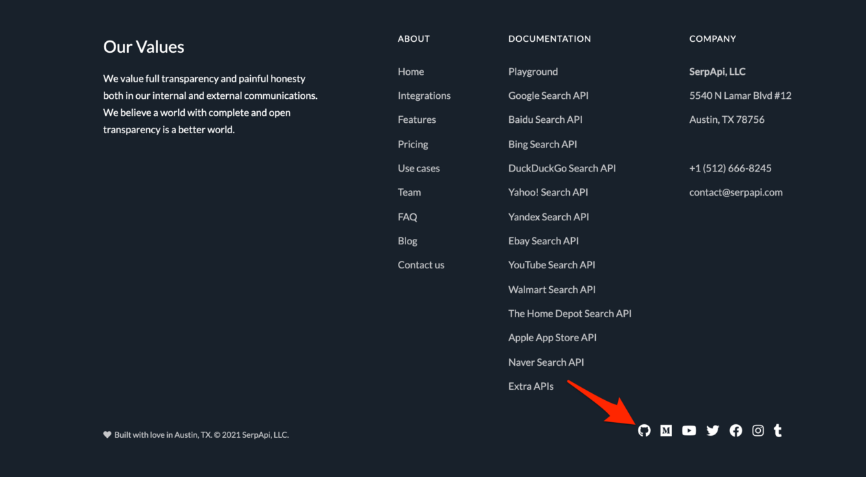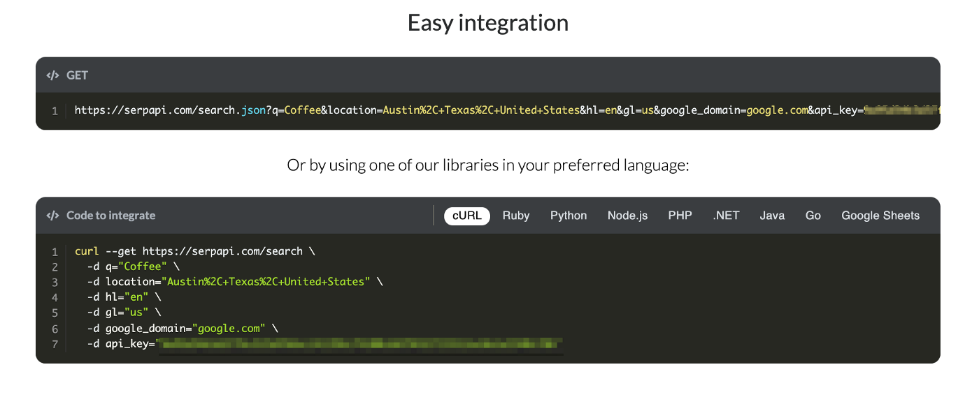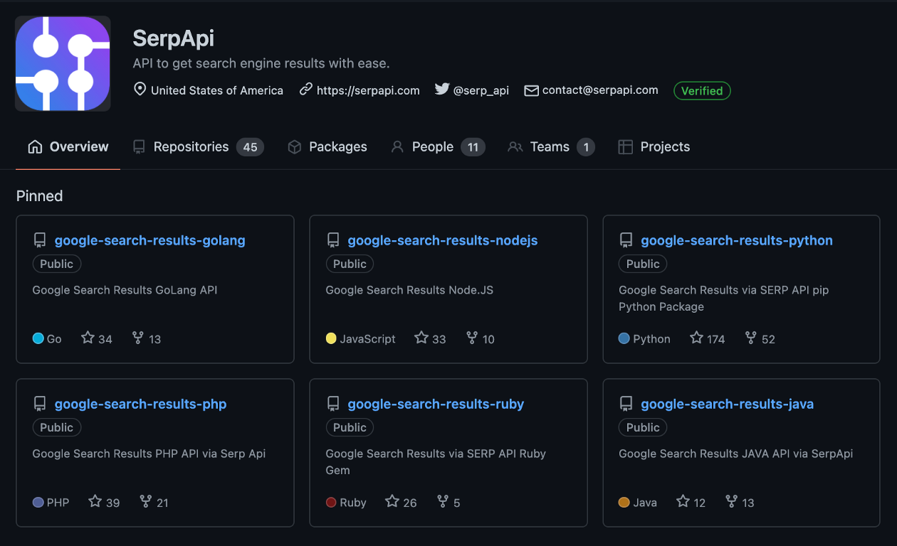 Farther down the homepage of SerpApi there are links that include our Github page for the libraries that we support…These all coincide with the code tabs illustrated above on our front page; cURL, Ruby, Python, Node.js, PHP, .NET, Java, Go, and the little bit of the oddball implementation Google Sheets.