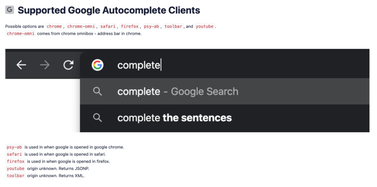 And this link brings us to the SerpApi page of Supported Google Autocomplete Clients: