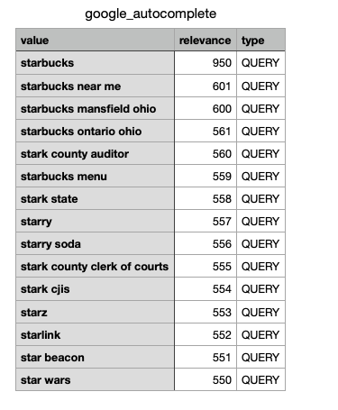 In this tutorial, we will scrape keyword suggestions when searching with the "star" keyword. Will Google suggest "Starbucks" or "Star Wars"...? The data contains: "value", "relevance", "type", and more. You can also scrape more information with SerpApi.