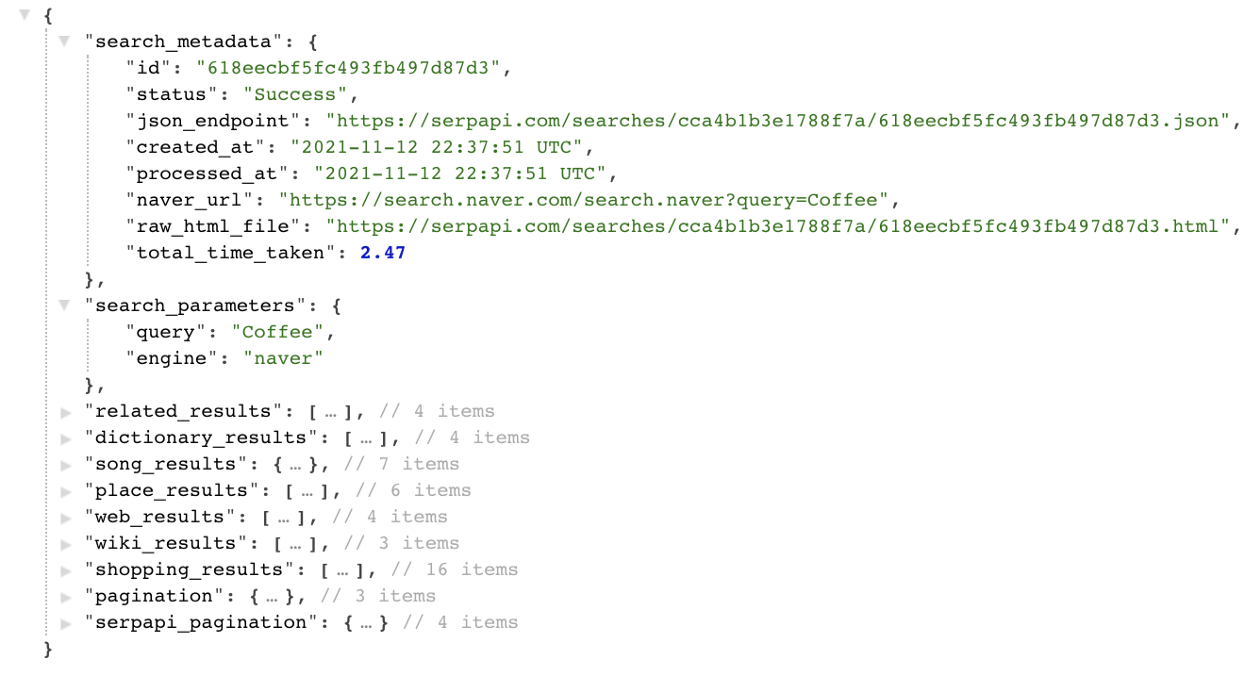 Instead of Google’s organic_results key value pair, Naver’s is set to web_results.