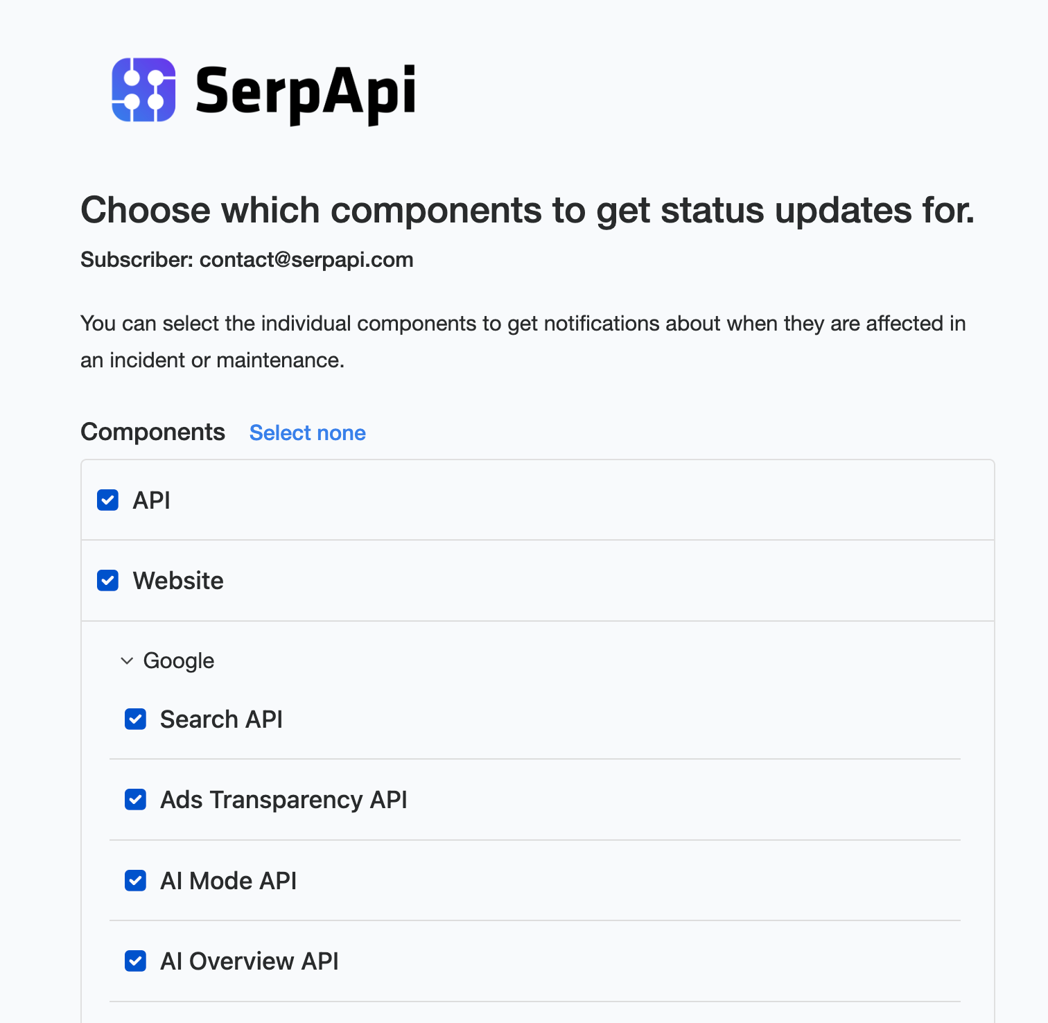 Once you reach the component selection page, you can customize the notifications you receive based on the SerpApi services most relevant to your use case. By default, all APIs are selected, but you can easily narrow this down by selecting only the APIs you rely on (for example, just the Google Search API or AI Overview API).