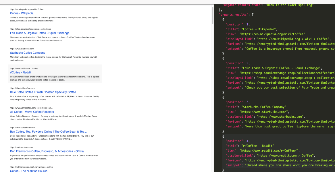 coffeewith any keyword you want to search for. - To get your API key, you can register for free at SerpApi.