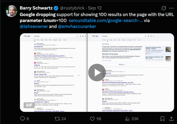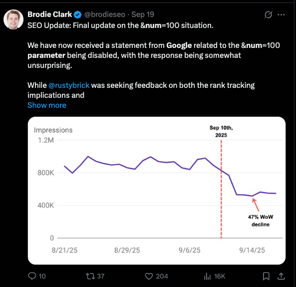 The removal of the num=100 (&num=100) parameter from Google has a lot of impacts on many SEO companies that need to serve ranking data for their clients. Many search API providers fail to scrape 100 search results, which results in many errors and misinformation on their platform.