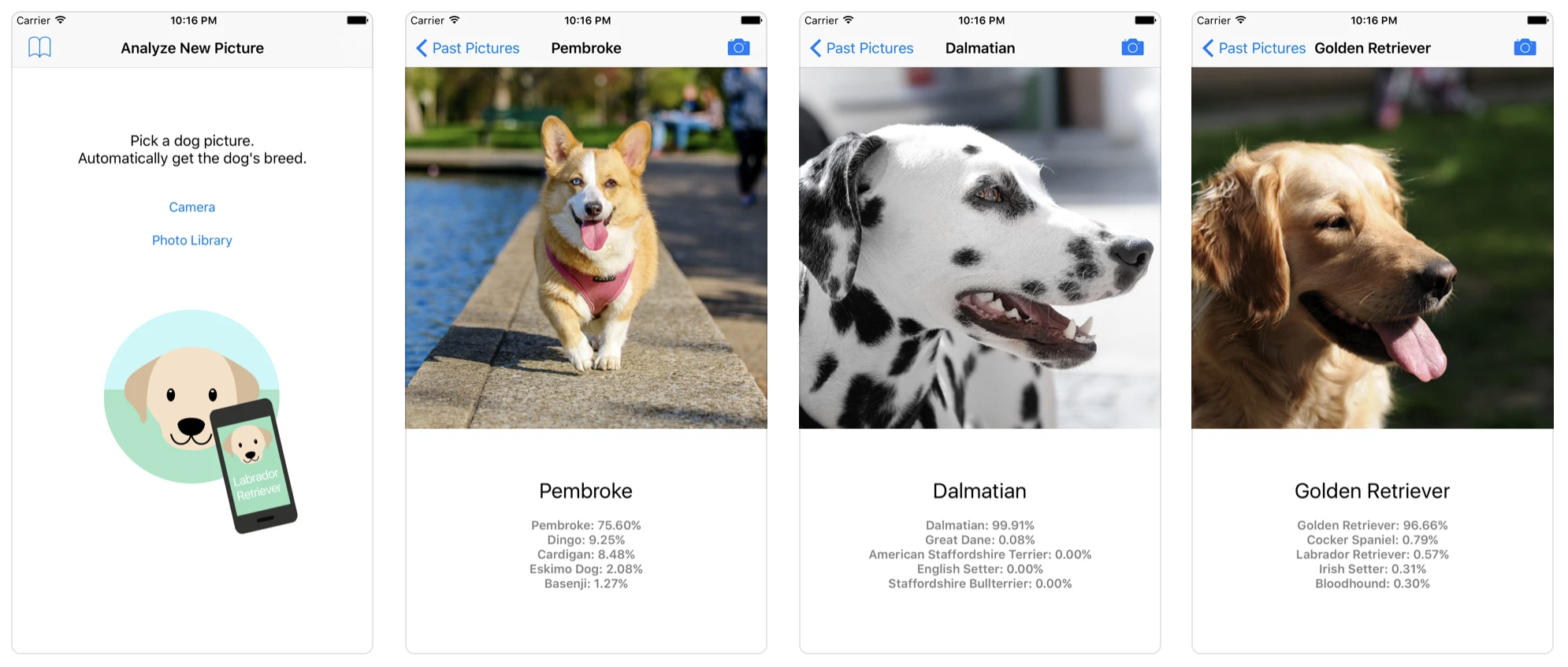 It feels like it was a long time ago. I was experimenting with porting machine learning models to iOS in order to make a couple of picture analysing apps just for fun. One was identifying food and trying to guess calories (I know it's almost impossible to be accurate!) and another was trying to guess dog breeds. Here's a snapshot of what the dog identifier one looked like: