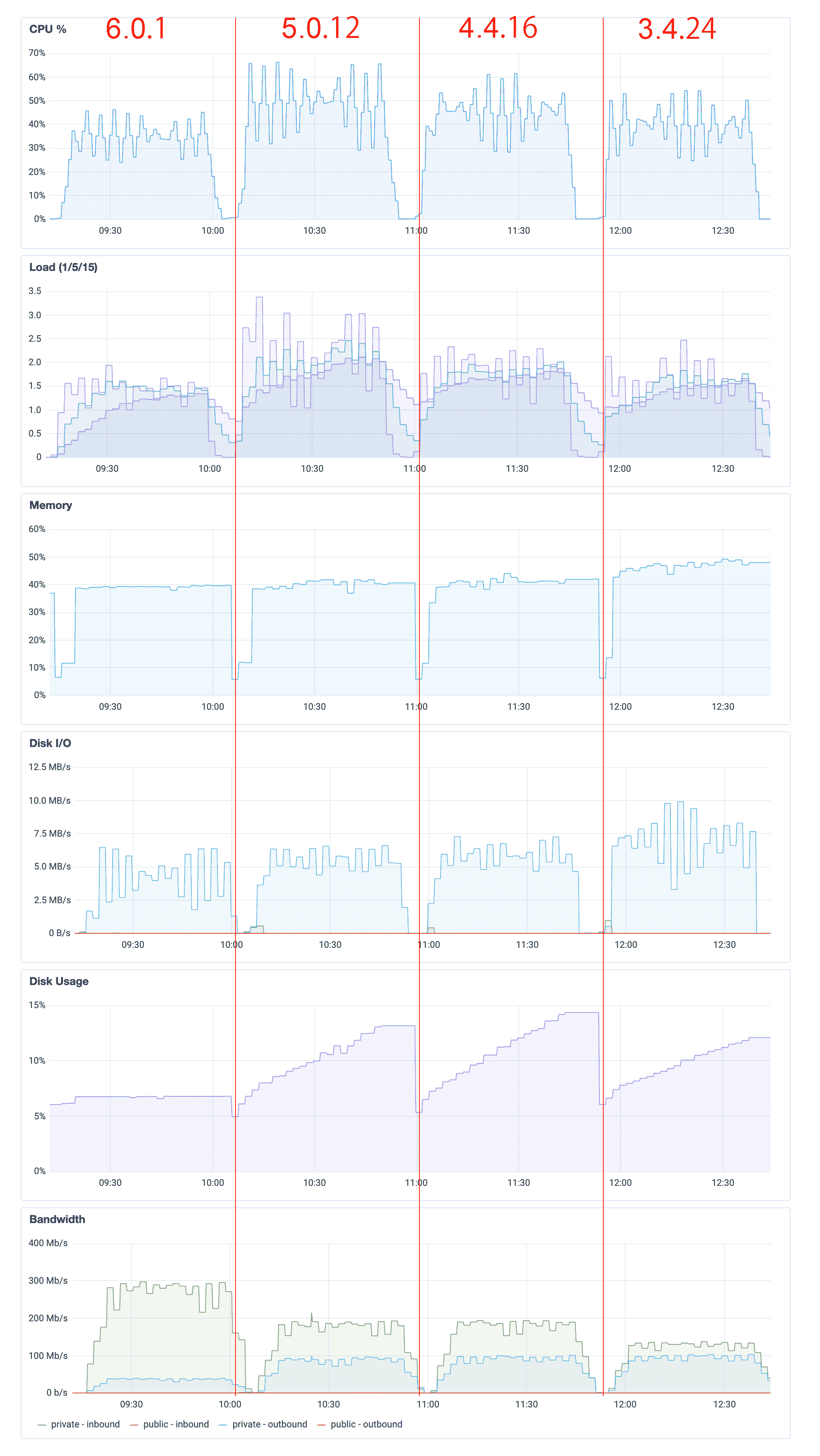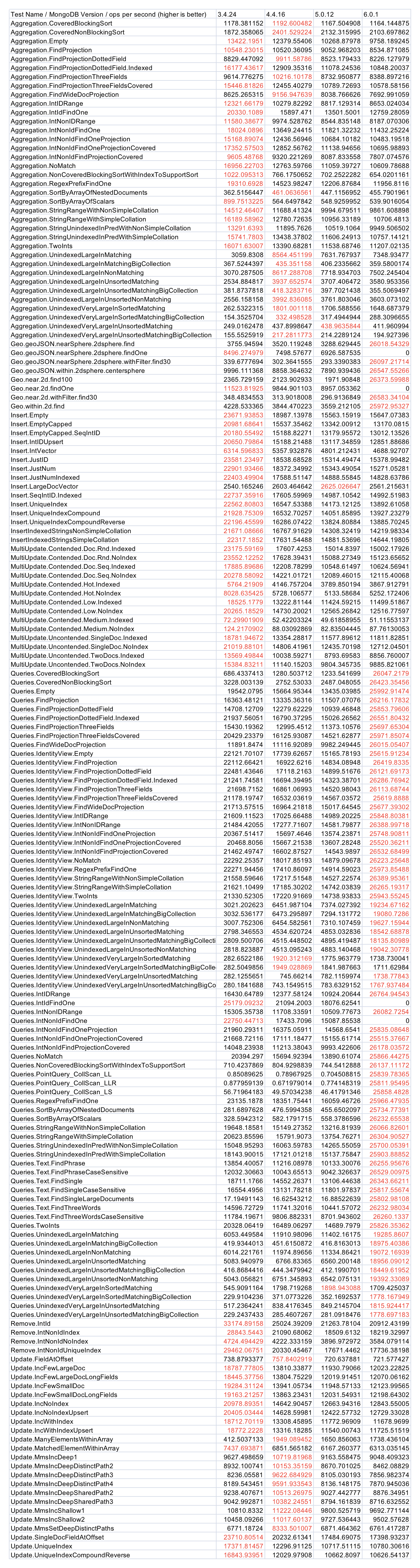 There's no reason for us to migrate to v4.4.16 and v5.0.12. As for v6.0.1, although it received an impressive query performance bump, probably related to the Slot-Based Query Execution Engine, its written operation performance was only around 60% of v3.4.24, which was the worst among all four versions. We won't risk trading writing performance with querying.