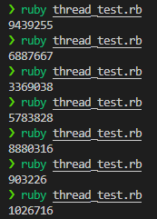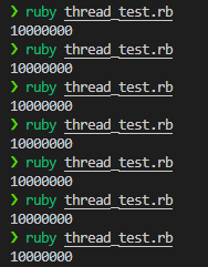 end.each(&:join)If you run the above code multiple times, you will always get 10000000 as the output