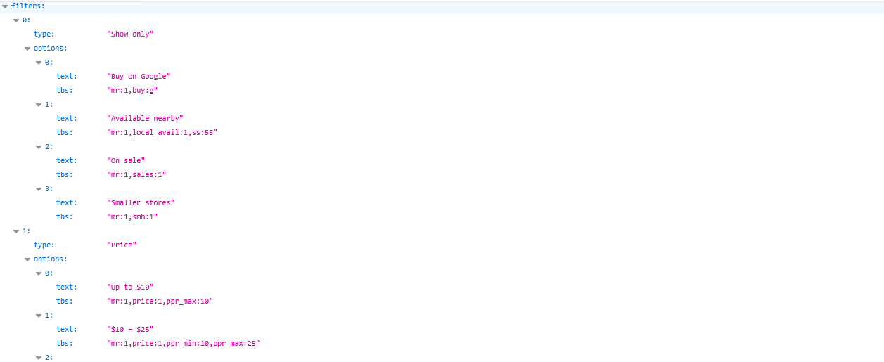 You may have noticed that each tbs filter starts mr1. If you chain two different tbs filters, you need to remove the mr:1 of the second and following filters. For example if you want to see only products sold by Google, you need to add mr:1,buy:g. Then, you wanted to add price filter and want to see tea products between $3.50 – $6. Now you need to chain mr:1,price:1,ppr_min:3.5,ppr_max:6 filter with mr:1,buy:g. If you combine them by using mr:1 in the begininng of the each param, like this, mr:1,buy:g,mr:1,price:1,ppr_min:3.5,ppr_max:6, it can get finicky. Removing the second mr:1 like mr:1,buy:g,price:1,ppr_min:3.5,ppr_max:6, it is not going to create any problematic/out of ordinary results.