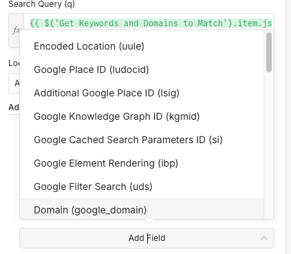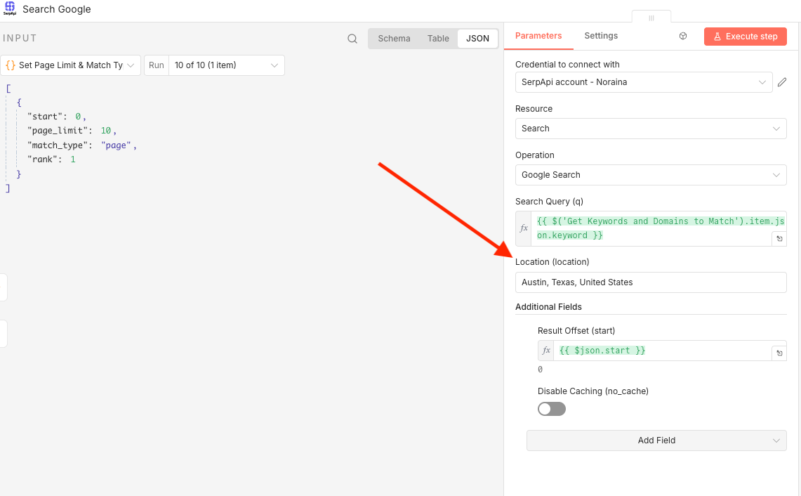 - In the "Search Google" node, you can set the "Location" of your choice.