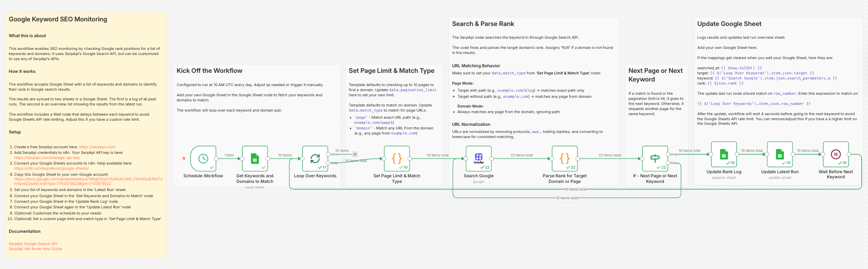 - A Wait node pauses the workflow between each keyword check to prevent exceeding Google Sheets API rate limit. You can adjust this delay if you have a higher quota or need faster execution.