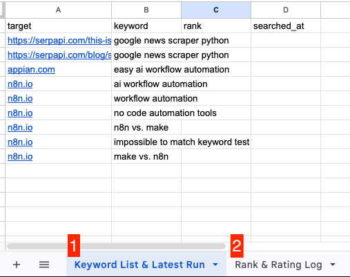 - Once it finds the rank, the results are written to two sheets within the same Google Sheet.