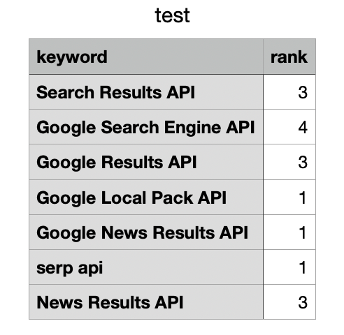 You can see in the above example that the first hit is a site with title: “SerpApi: Google Search API” and displayed_url: “https://serpapi.com” This means that for the keyword “serpapi” the domain “serpapi.com” has a rank of 1.