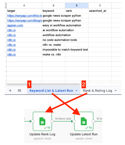 - Copy the sheet URL from "Rank & Rating Log" [2] and paste it in the "Update Rank Log" node and "Keyword List & Latest Run" [1] in the "Update Latest Run" node