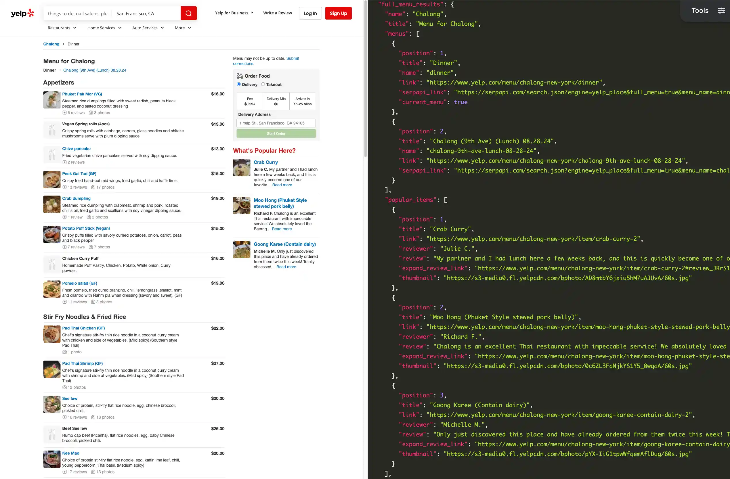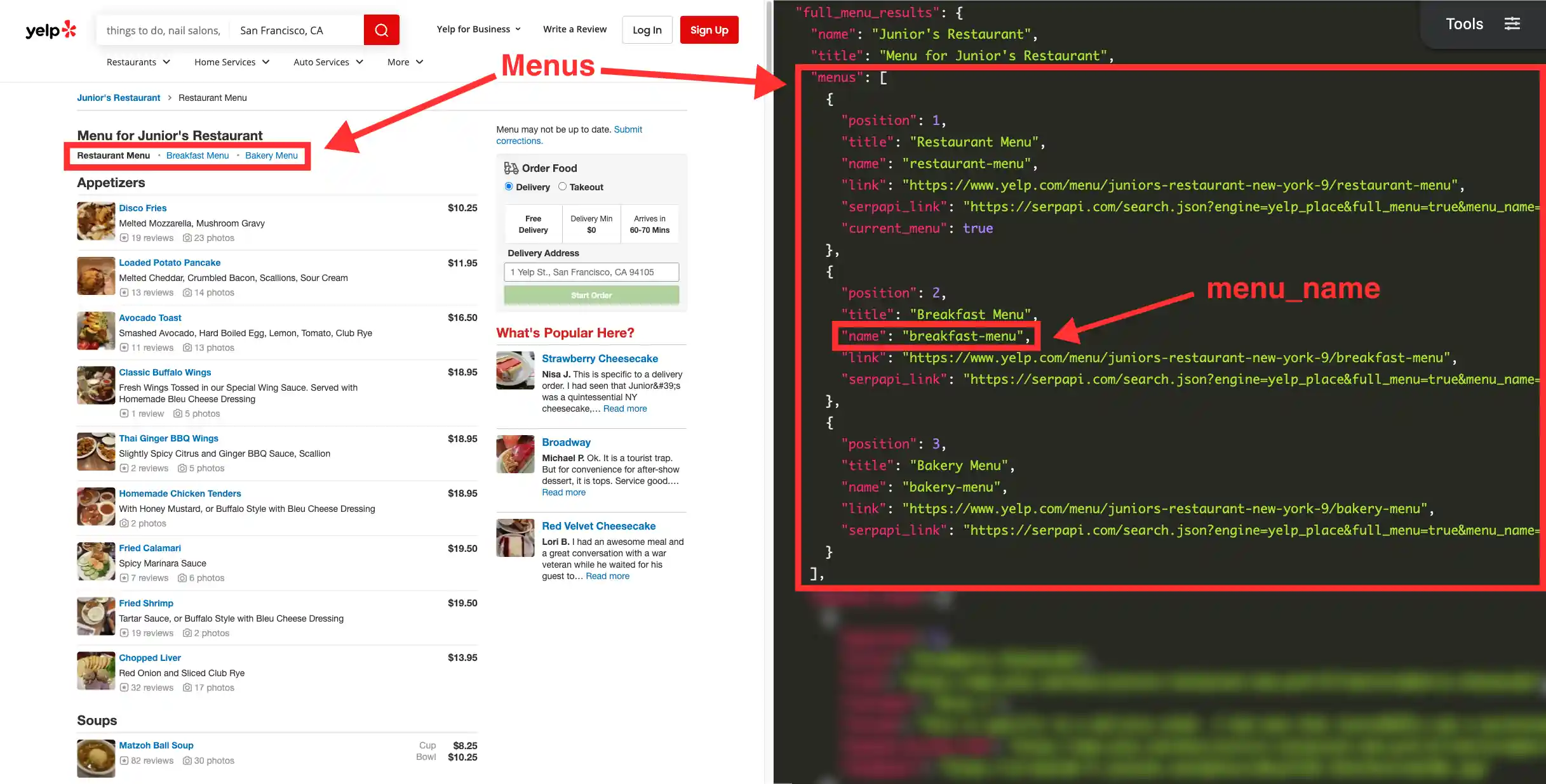 Now that we know if a restaurant has a Full Menu page, we can easily scrape it using SerpApi's Yelp Place Scraper API by setting the request parameter full_menu to true to get full_menu_results.