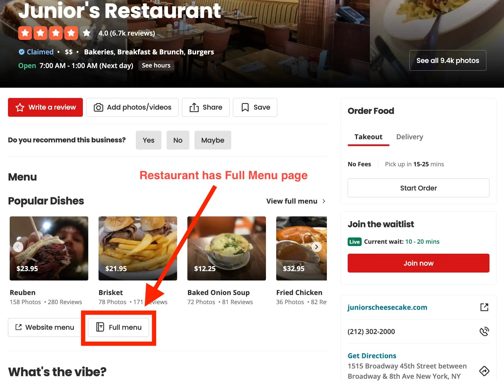 In Yelp, for the restaurants that have set up their Full Menu page, there is a big button called "Full Menu" on their Yelp Place page: