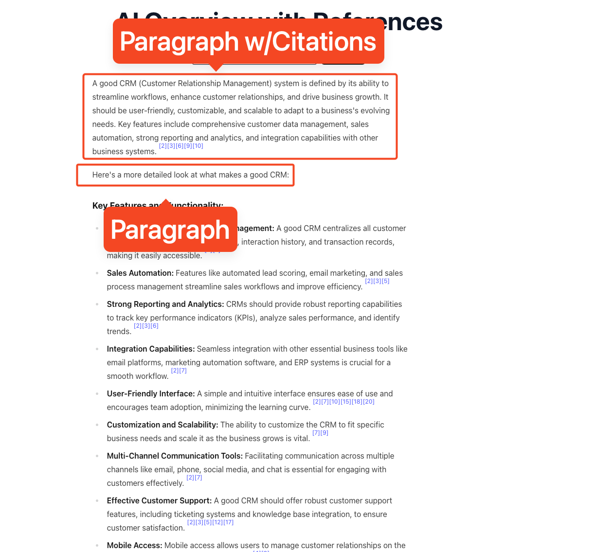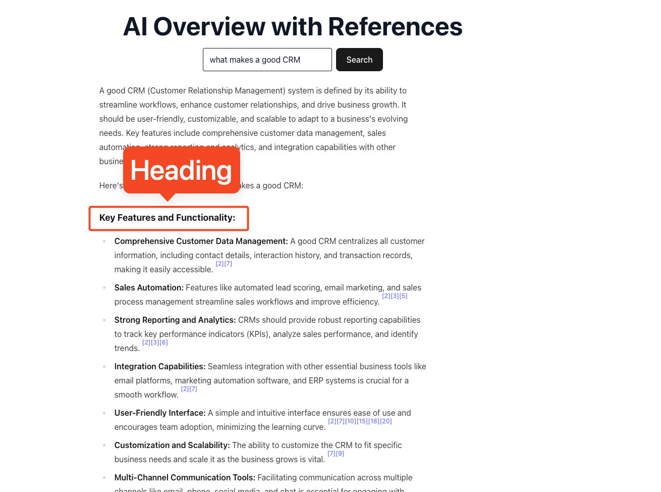 snippet_highlighted_wordsfor emphasis andreference_indexesfor inline citations. - Heading: section titles that segment the overview (for example, “Key features and functionality”, “Additional considerations”).
