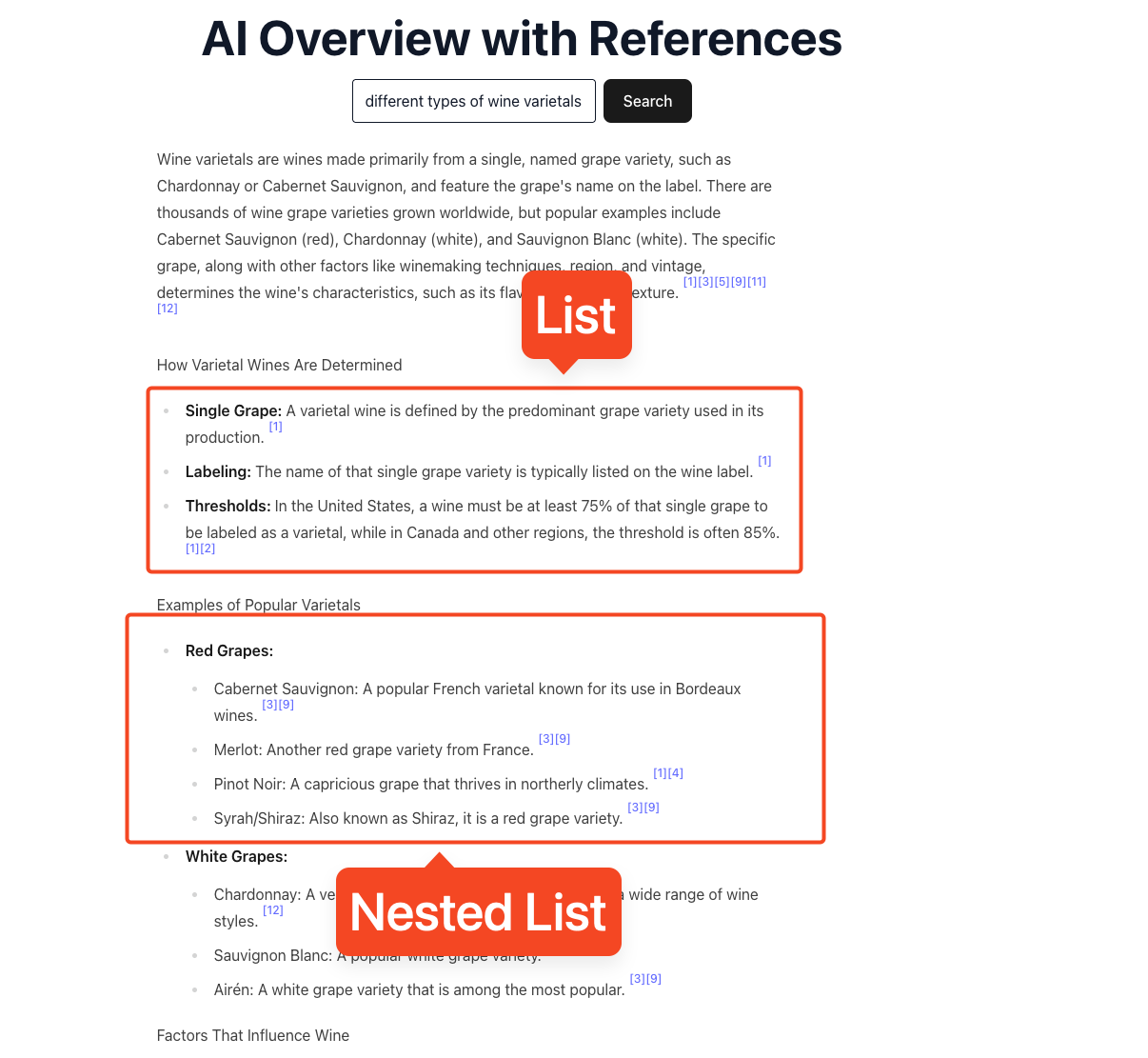 listis an array of items. Each item has atitle, asnippet, and optionalreference_indexes. Typically in the form of unordered lists.