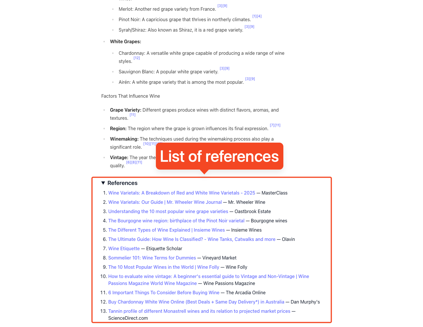 text_blocks: ordered content blocks to be shown in sequence (paragraphs, headings, lists).references: a flat array of citations you can map to via numeric indices.
