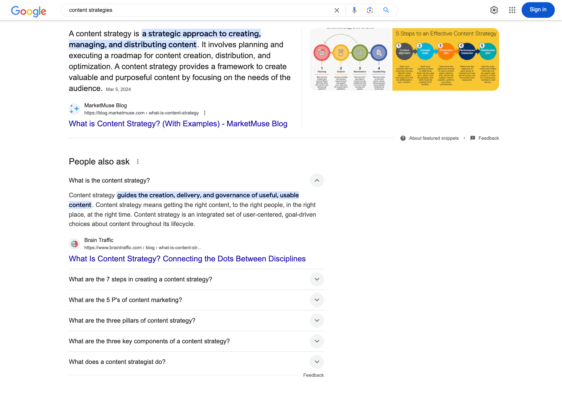 What makes PAA boxes particularly valuable is their dynamic nature. For example, if a user searches for "content strategy" and clicks on a PAA question like "What are the steps to creating a content strategy?", new related questions will appear, such as "How do you measure the success of a content strategy?" or "What tools help with content strategy development?" This continuous expansion of queries provides deeper insights into user search intent. This behavior reflects real user interests and search patterns, providing authentic insights into an audience's thought processes and information needs.