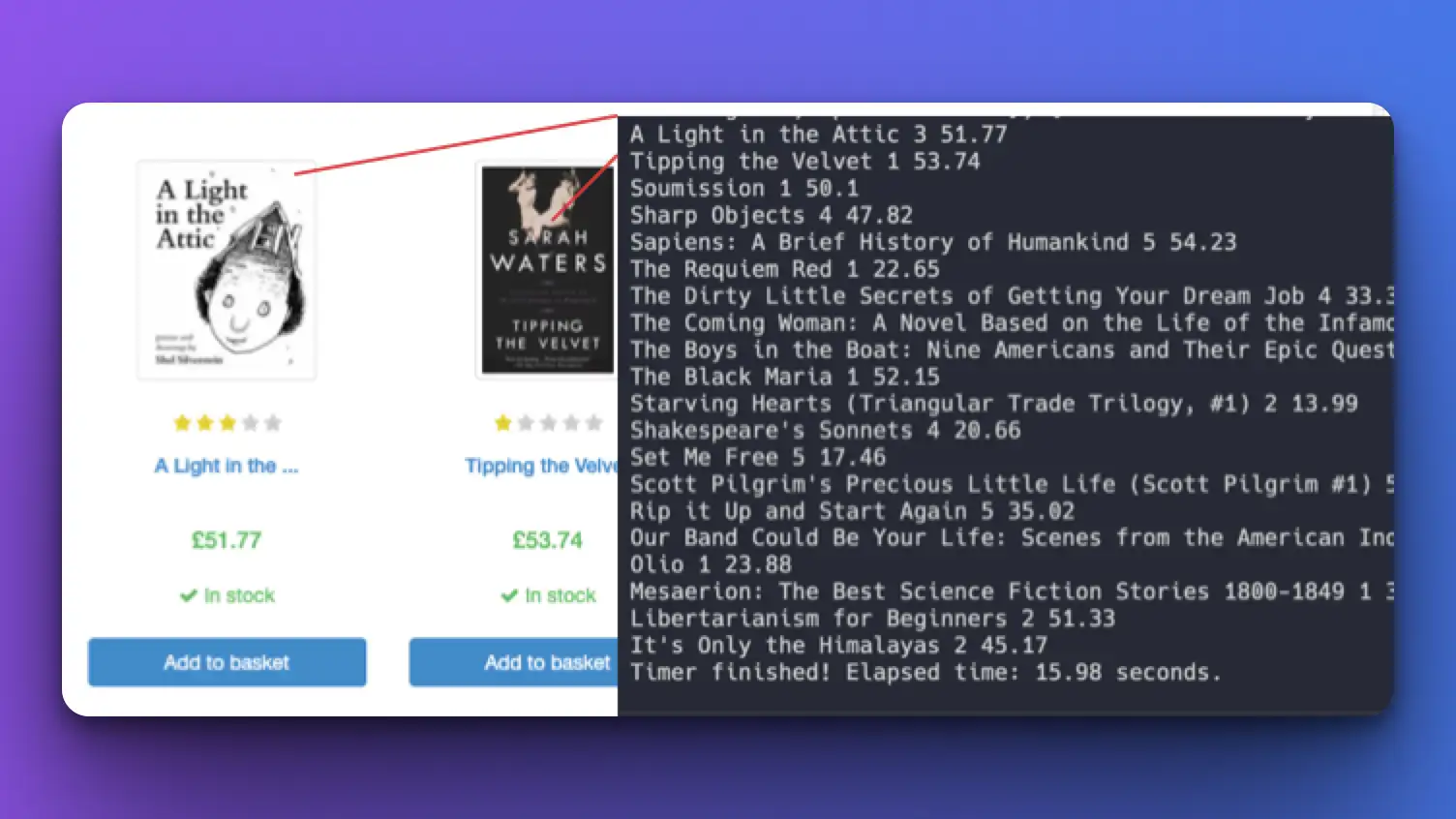 We're able to scrape the title, rating, and price (exactly the data we defined in the function parameters above) of each book.