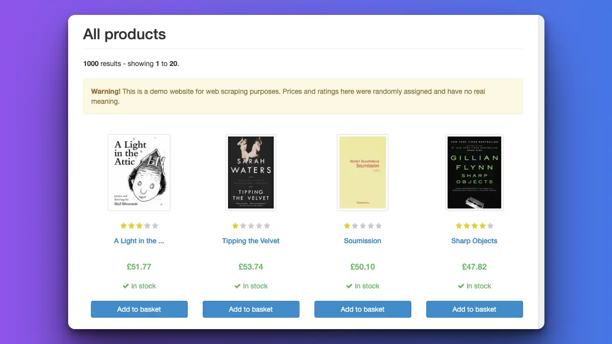 Let's warm up first. We'll target the https://books.toscrape.com/ site first since it has a very clean structure that makes it easy to read.