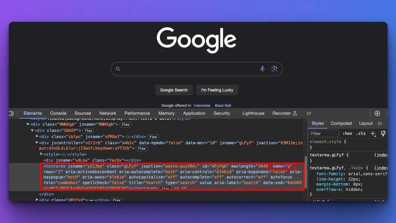 Let's say we want to fill out and submit a form on google.com. I'll open the actual URL in my real browser and find out what HTML tag or CSS selector this element is on.