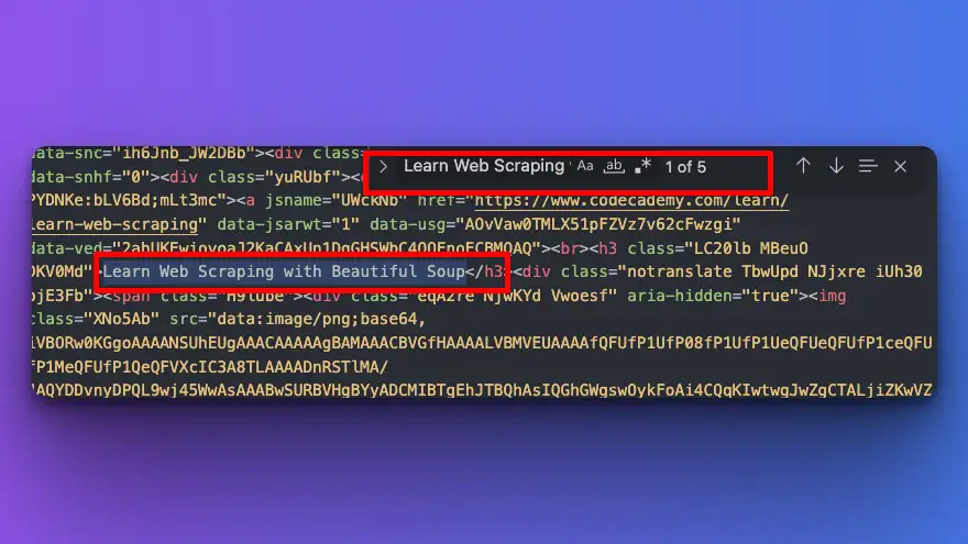 Now, I know that one of the organic results include "Learn Web scraping with Beautiful Soup" text. I will then search this text on my text-editor.