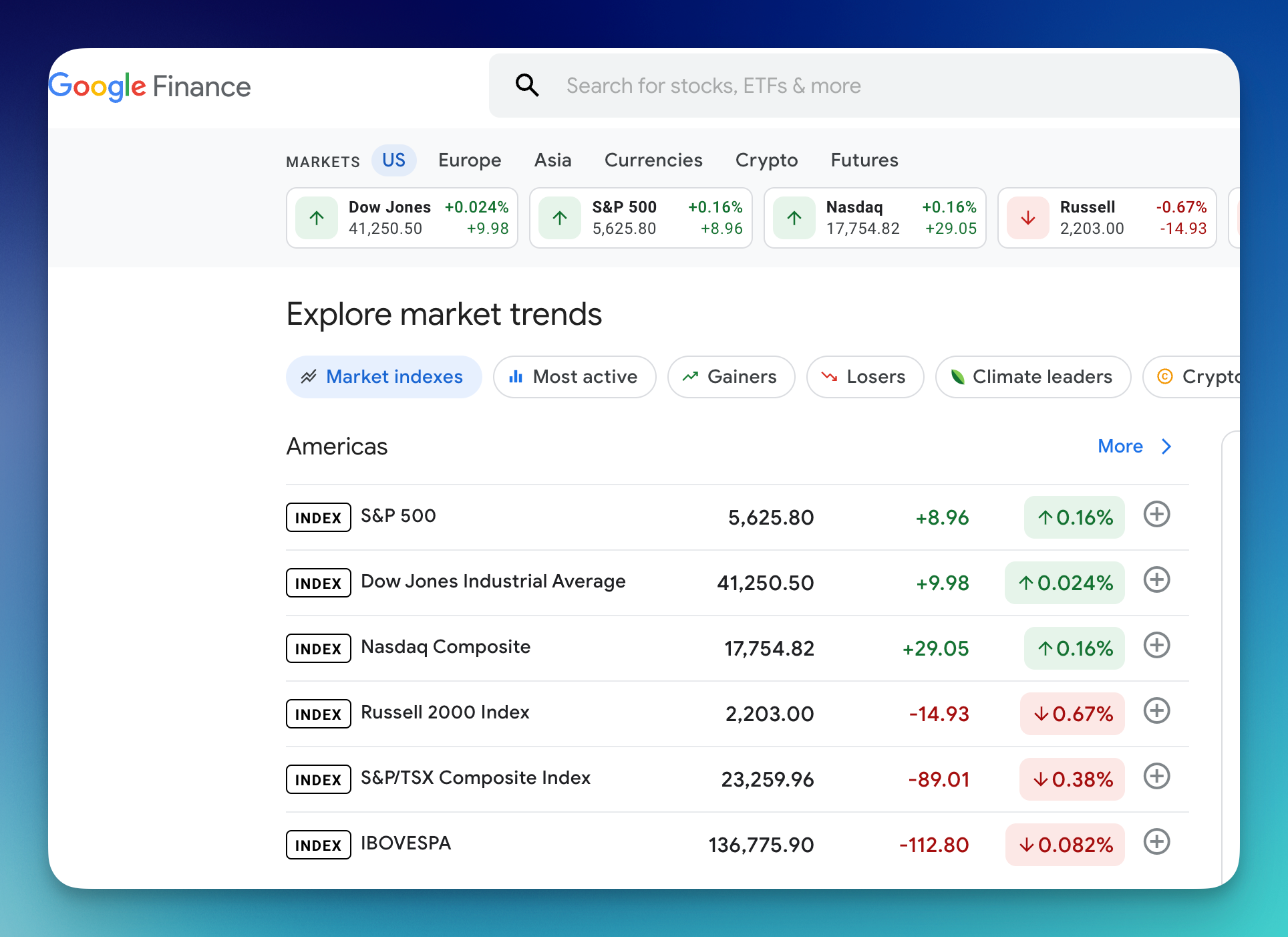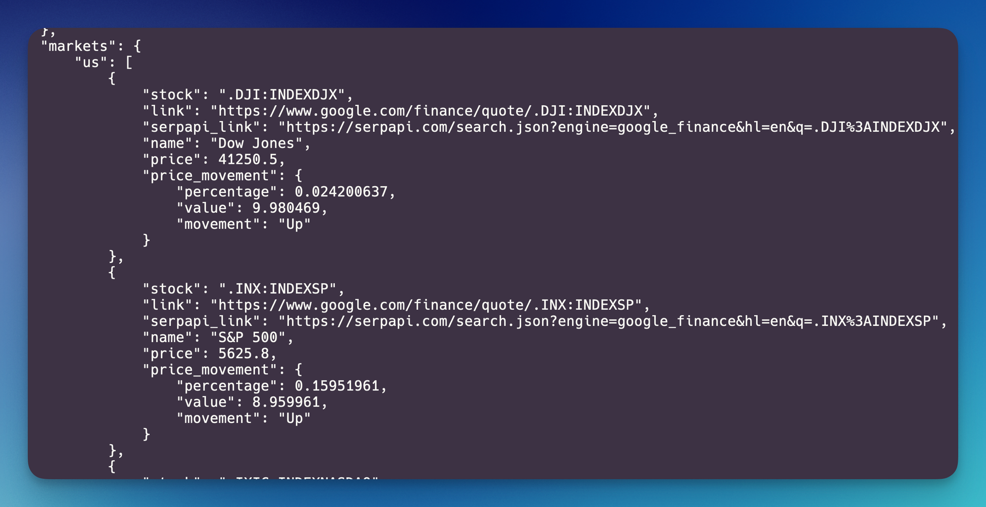SerpApi also provides the API for current market trends from this page: https://www.google.com/finance/markets/indexes?hl=en. We can use Google Finance Markets API for this.