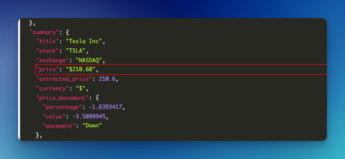 Usually, you'll write your DIY solution using something like BeautifulSoup, Selenium, Scrapy, Requests, etc., to scrape Google Finance results. You can relax now since we perform all these heavy tasks for you. So, you don't need to worry about all the problems you might've encountered while implementing your web scraping solution.