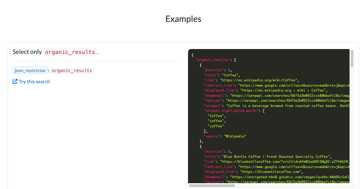For example, to only select organic_results, you would set json_restrictor=organic_results. For only the first 3 organic results, you set json_restrictor=organic_results[0:3].