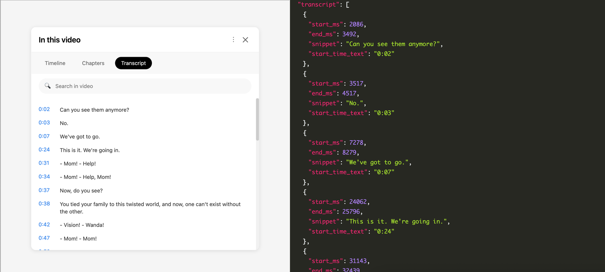 We’ve also released a new YouTube Video Transcript API, which lets you easily extract transcripts, chapters, and subtitle tracks from YouTube videos—making it simpler to analyze and integrate video content into your workflows.